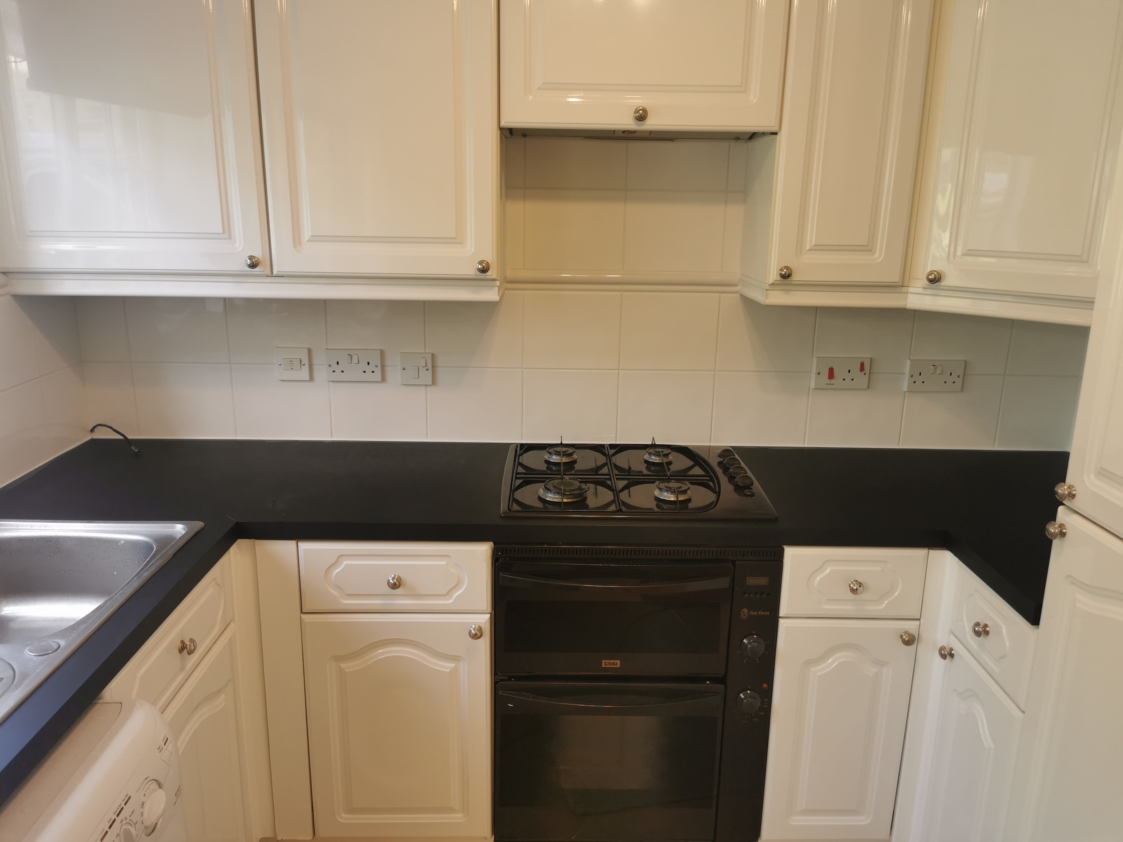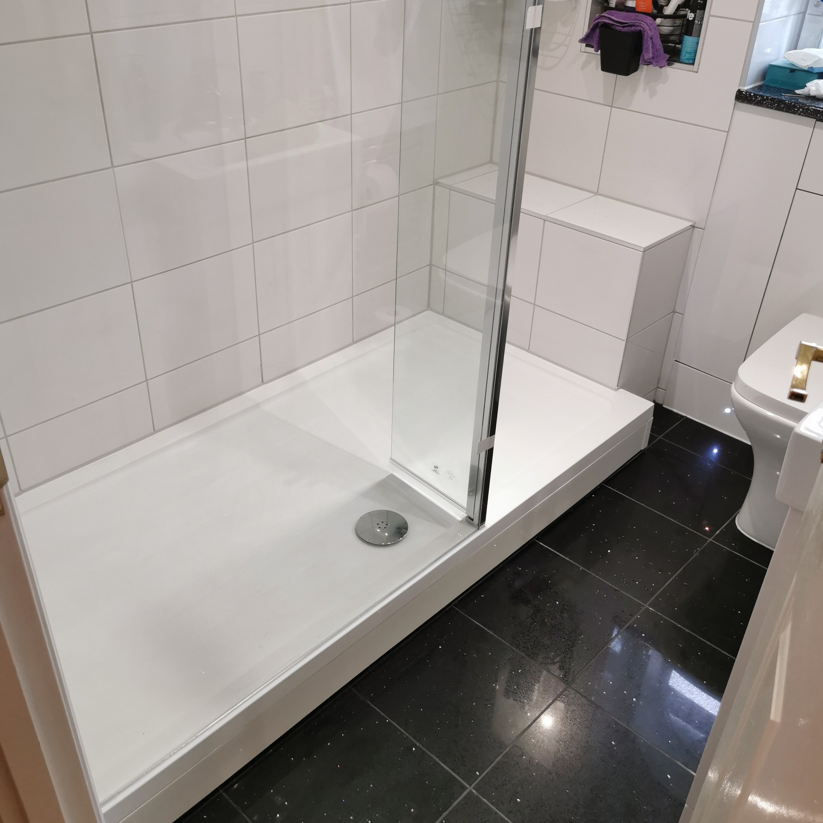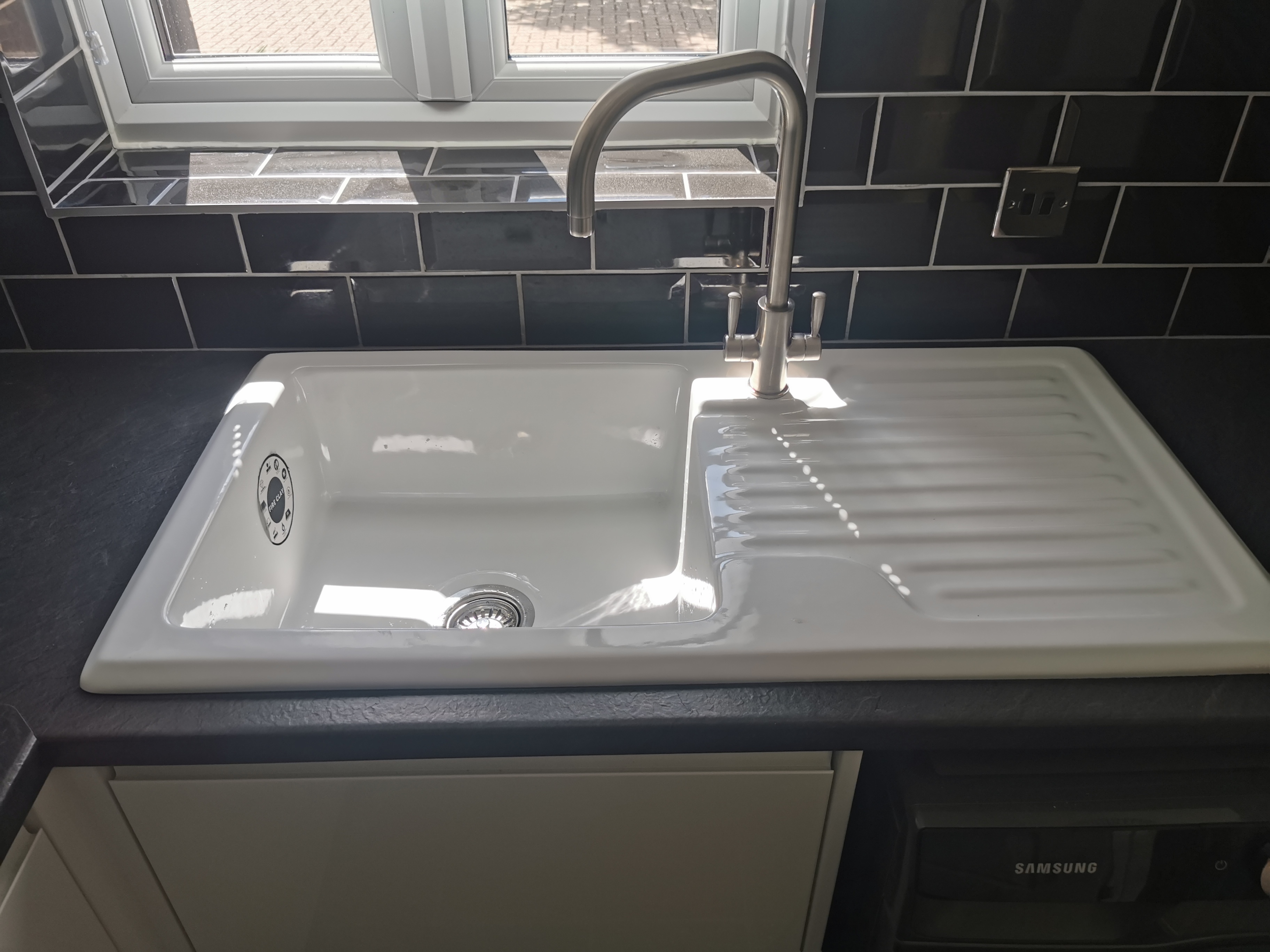 Porcelain kitchen sink replacement with modern tap and black metro wall tiling.