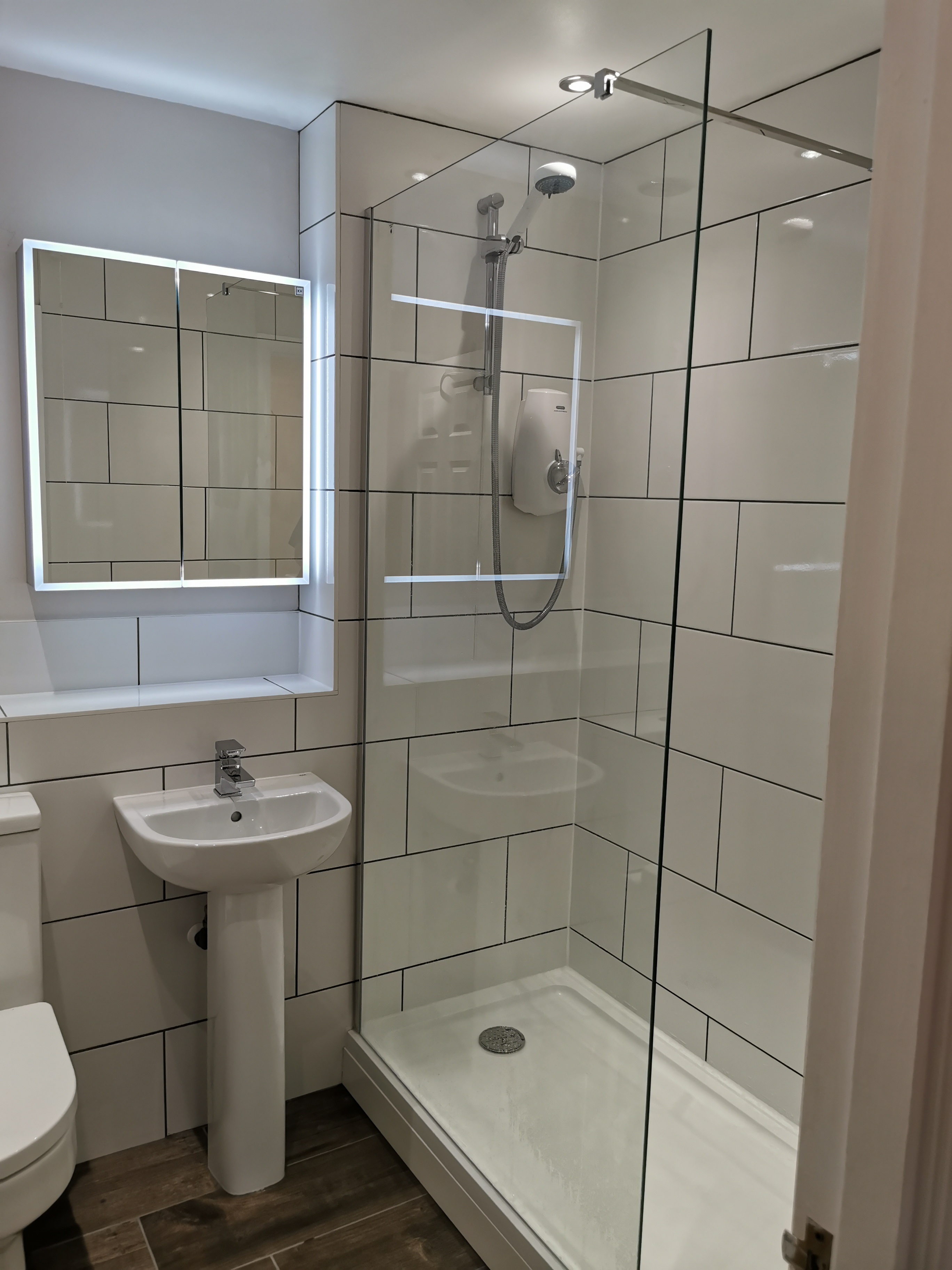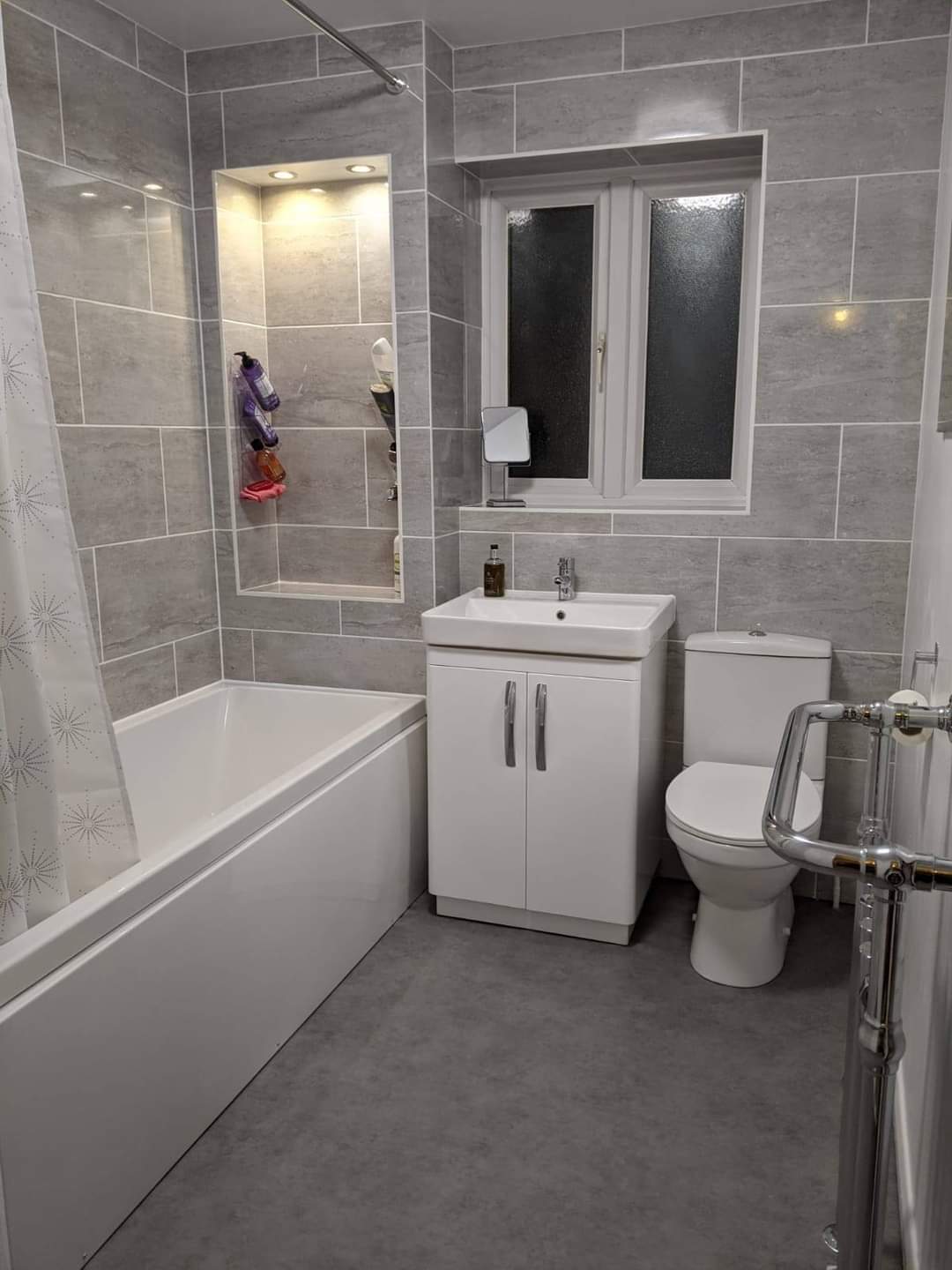 Porcelain kitchen sink replacement with modern tap and black metro wall tiling.